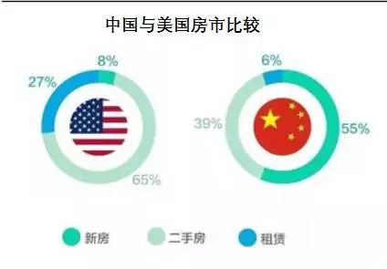 自 从 1950 年代开始,美国楼市的房屋新开工和存量趋于稳定,二手房市场逐步取代新房市场交易成为主导力量。这还是因为其土地开发殆尽,城市化完成度高,因此大部分交 易都是二手房交易。这类似于中国的一线楼市,而三四线城市则有大量未开发土地,因此交易以新房为主,二手房次之。据统计,二手房交易占到美国房产市场的65%,而只占到中国房产交易的39%。这个比例,大致也能说明中国一线与三四线楼市的区别。